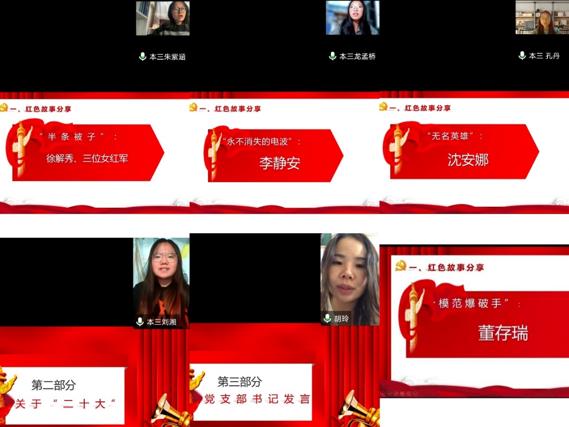 威廉williamhill体育本科生第三党支部开展“喜迎二十大”红色故事分享会活动,学习老一辈的无产阶级革命家和革命先烈的先进事迹,包括“模范爆破手”董存瑞、“半条被子的温暖”、“战斗在敌人心脏的无名英雄”沈安娜、“永不消逝的电波”李静安,教育引导广老员工党员传承红色基因,赓续红色血脉,走好新时代的长征路。
