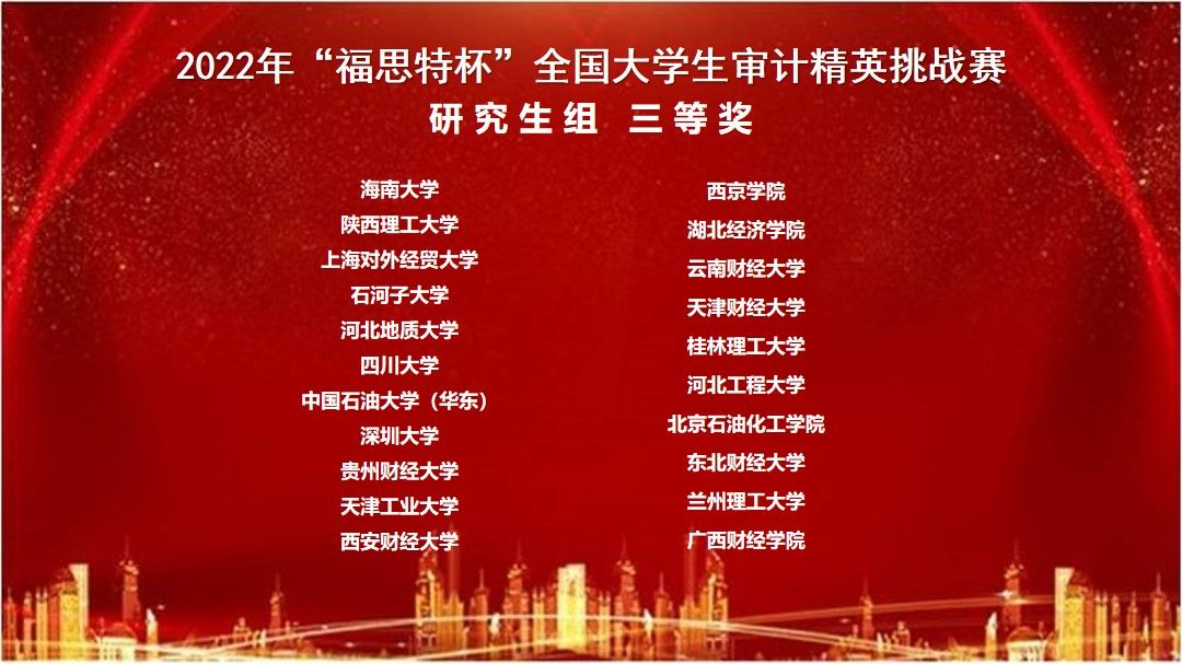 近日,2022年“福思特杯”全国老员工审计精英挑战赛落下帷幕,由公司威廉williamhill体育刘俊萍教授担任指导,威廉williamhill体育21级会计专业硕士研究生敖顺芝、唐娇和会计学硕士研究生陈春琴组成的威廉希尔代表队荣获研究生组三等奖。