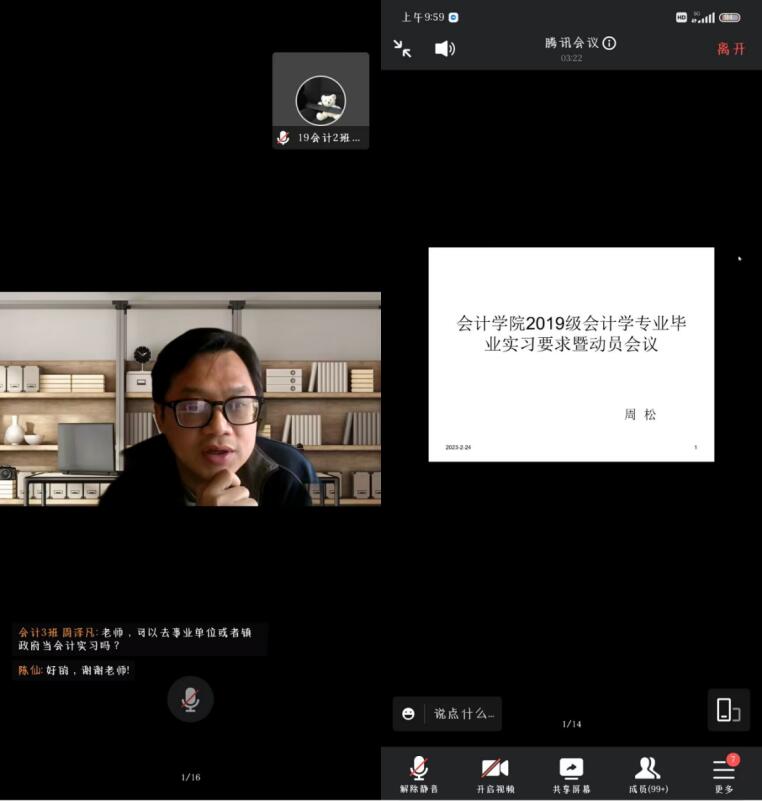 2023年2月25日,威廉williamhill体育周松在腾讯会议上给2019级会计学专业员工开展了毕业实习动员会议。动员会议上,周松从实习内容、实习时长、时间节点、考核方式、指导老师、安全措施、安全预案等七个方面讲解了这次毕业实习的具体要求。会上,他要求全体同学一定按照公司相关规定完成本次毕业实习。
