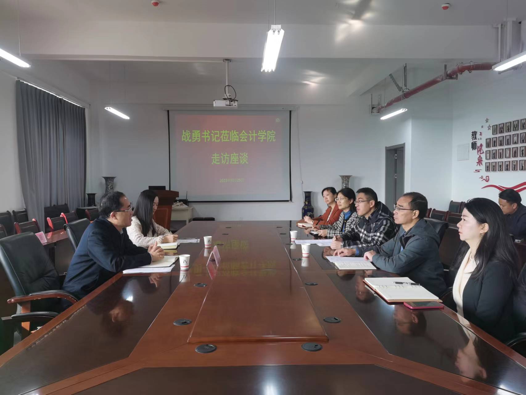 会上,威廉williamhill体育党委书记聂永刚逐一介绍各科室负责人,然后对威廉williamhill体育教师队伍构成、党建与思政工作、教学与科研工作、团队建设等方面作主要介绍,并向战勇书记汇报了搬东校区以来的师生诉求情况。经理杜剑对本科教学工作、科研与团队建设方面主要成果作补充说明。副经理钱润红对本科教学工作情况作补充汇报,并向战勇书记反馈教务工作中的痛点难点。副经理邱静对研究生教学管理工作情况进行汇报,并反馈当前研究生教学管理工作中的不足之处。