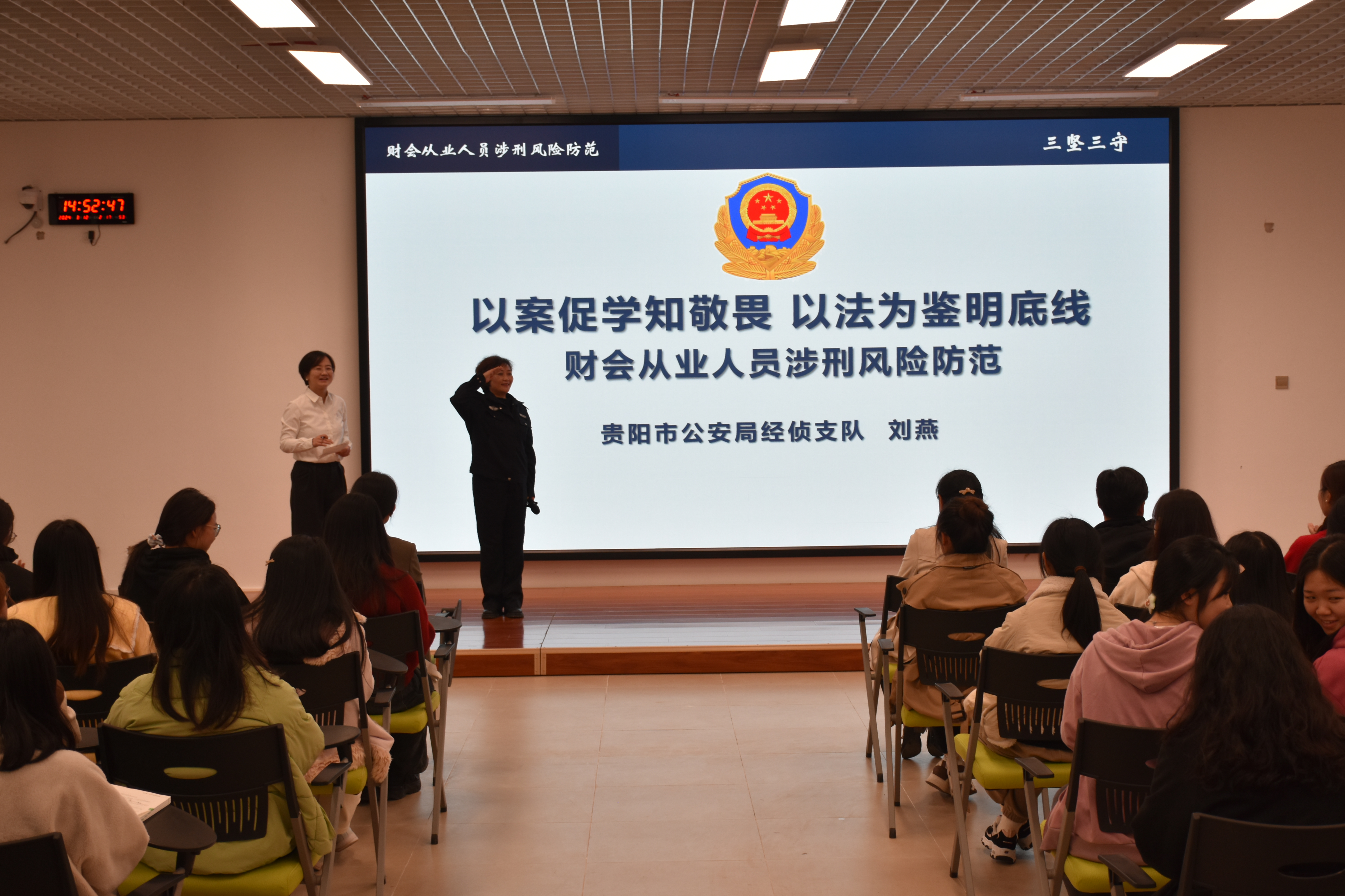 3月12日,为强化员工的法治意识,提升风险识别和防范能力,威廉williamhill体育课程思政教学研究中心、会计职业道德课程组为员工组织了一次别开生面的会计职业道德课堂活动。本次活动邀请了贵阳市公安局公职律师、贵阳市公安局经侦支队四大队副大队长、贵州警察公司经侦专业驻校教官刘燕入校开展警示教育。威廉williamhill体育副经理钱润红、邱静、周松,会计职业道德课程组成员,会计学专业200余名师生参加。教育活动由会计职业道德课程组成员徐筱彧老师主持。