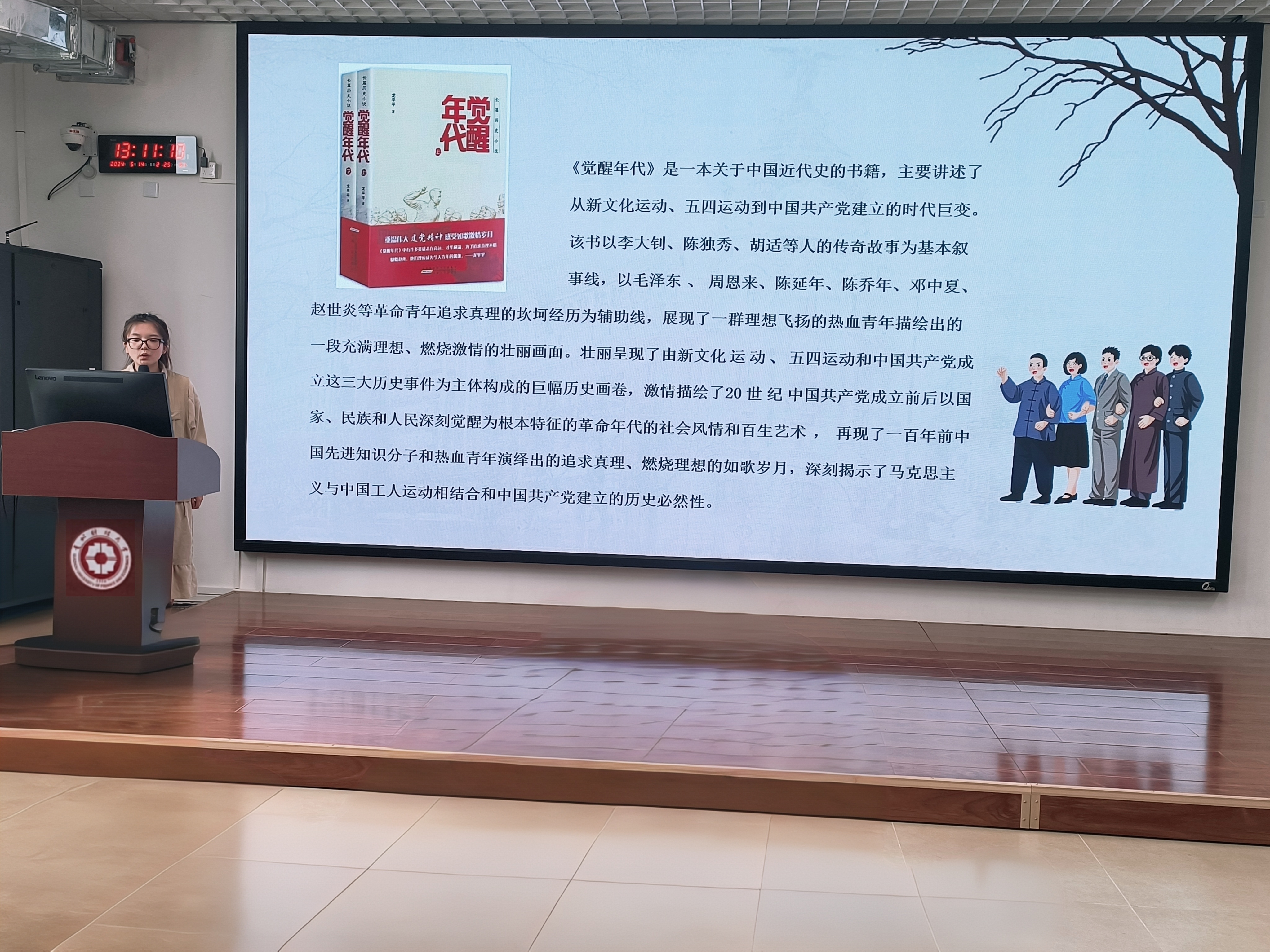 紧接着,活动进入读书分享会环节,三名党员代表分别上台分享书籍。其中,本科生第一党支部蒋志香分享的书籍是《平凡的世界》,她结合自己父亲战胜病痛的故事展开分享,她认为,《平凡的世界》并不是惊涛骇浪的传奇,而是平凡而宁静的最真实的生活,大家都是在这世界上平凡的一员,但每个人都在用责任与奋斗书写着不平凡的人生。研究生第一党支部刘瑞硕分享的书籍是《红岩》,她列举了成岗、江姐、许云峰的革命事迹,引出共产党人参加革命过程中的大无畏精神和牺牲精神,强调书籍中的经典话语“我们不能只做革命的看客,而必须成为革命的实践者”。研究生第二党支部的曾凡秀分享的书籍是《觉醒年代》,她列举了书中毛泽东、李大钊、陈独秀等伟人的故事,希望广大青年们积极响应号召,“能做事的做事,能发声的发声,有一分热发一分光”。