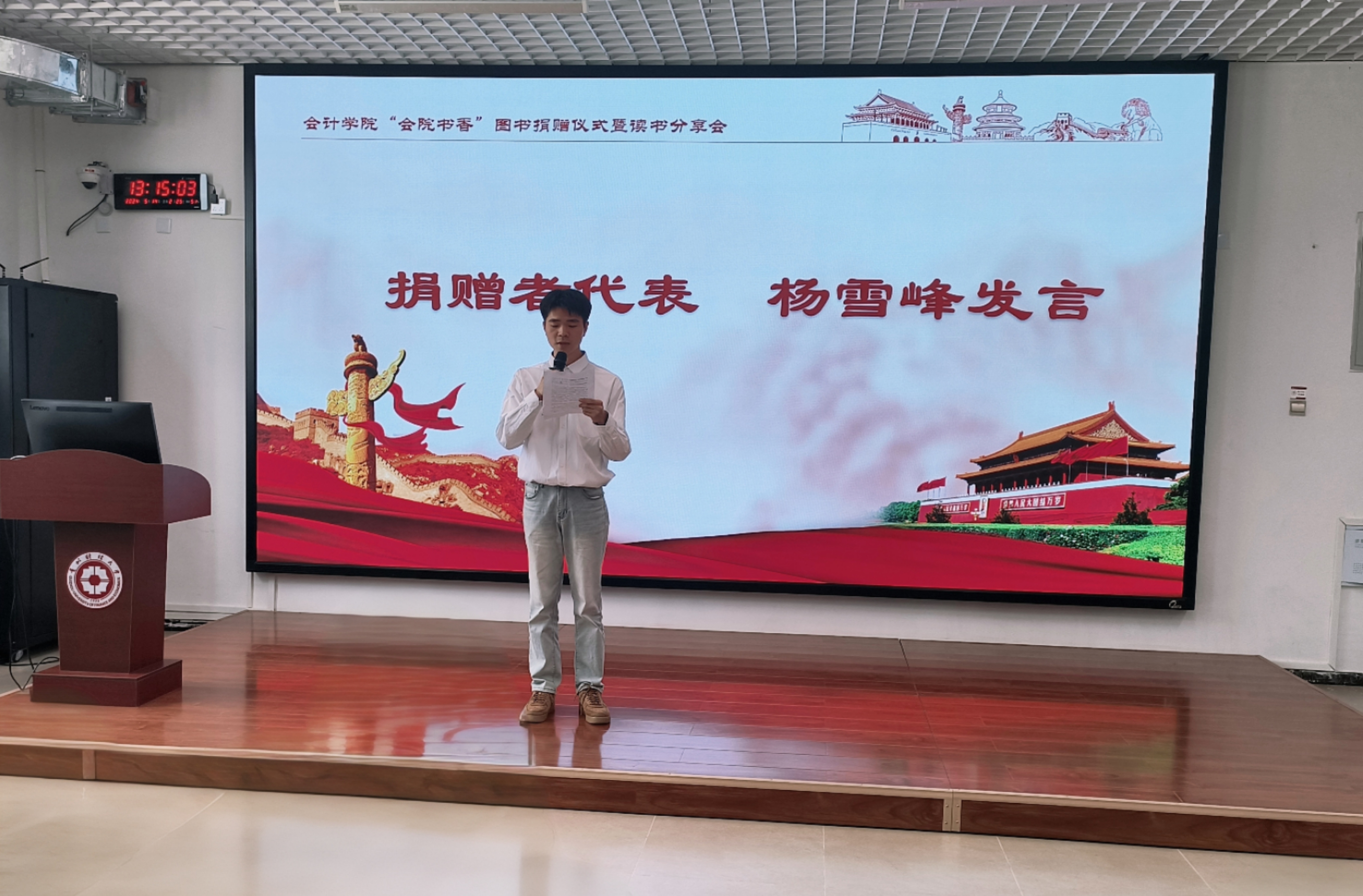 捐赠者代表杨雪峰和受捐者代表杨璐分别上台发言,表示将发扬会院传统,传递书香氛围,将常读书的好习惯坚持下去,从书中不断汲取精神食粮,用理论指导实践,不断强化个人修养。