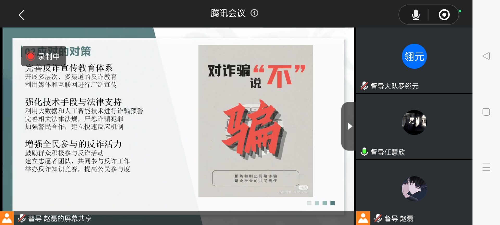 活动中,同学们从反诈意识的普及、反诈行动的实施、反诈教育的深化,以及全民反诈的挑战与对策四个方面共同学习反诈安全教育知识,认识到提高全民反诈能力的重要性,也了解到常见的诈骗手段,学习了防范电信诈骗的方法。同时大家也积极交流分享身边的电信网络诈骗真实案例,为同学们敲响了反诈安全的警钟,提醒同学们时刻保持警惕,对于电信网络诈骗要做到不听、不信、不转账。此外,各员工干部也通过号召公司各班级全体同学自主学习反诈知识并撰写心得感悟,将反诈宣传落实到每一位同学,构筑坚实的思想防线。