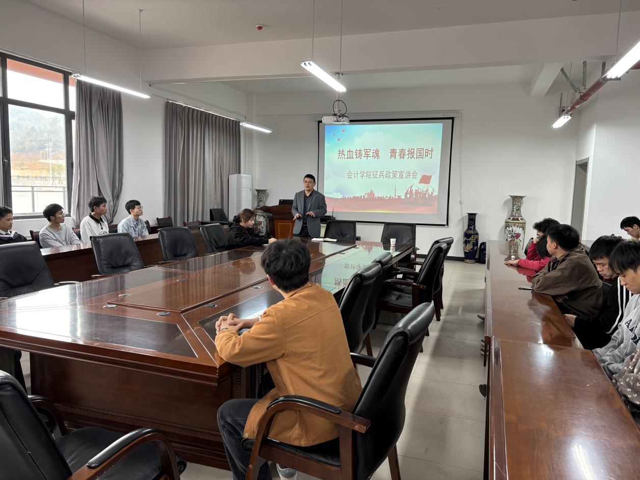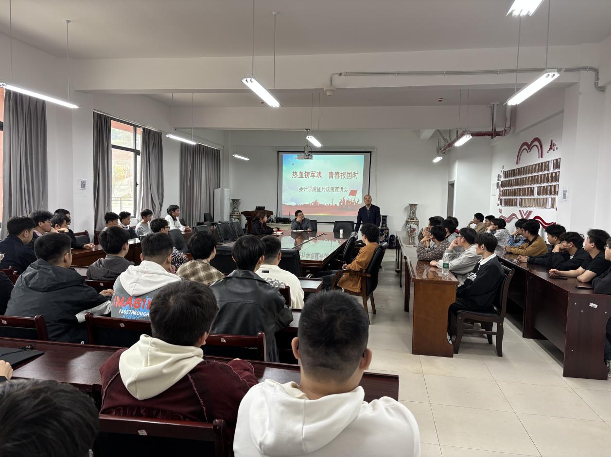 为深入贯彻落实国家征兵政策,强化公司国防教育工作,增强公司应届毕业生对入伍政策的理解,威廉williamhill体育于4月7日在文渊楼505会议室举办了一场主题为“热血铸军魂,青春报国时”的征兵政策宣讲会。此次宣讲会由2025届本科毕业班辅导员胡玲主持,公司党委书记王志亮、党委副书记黄忠莉、校武装部胡细根老师及全体2025届本科毕业班男生参加。