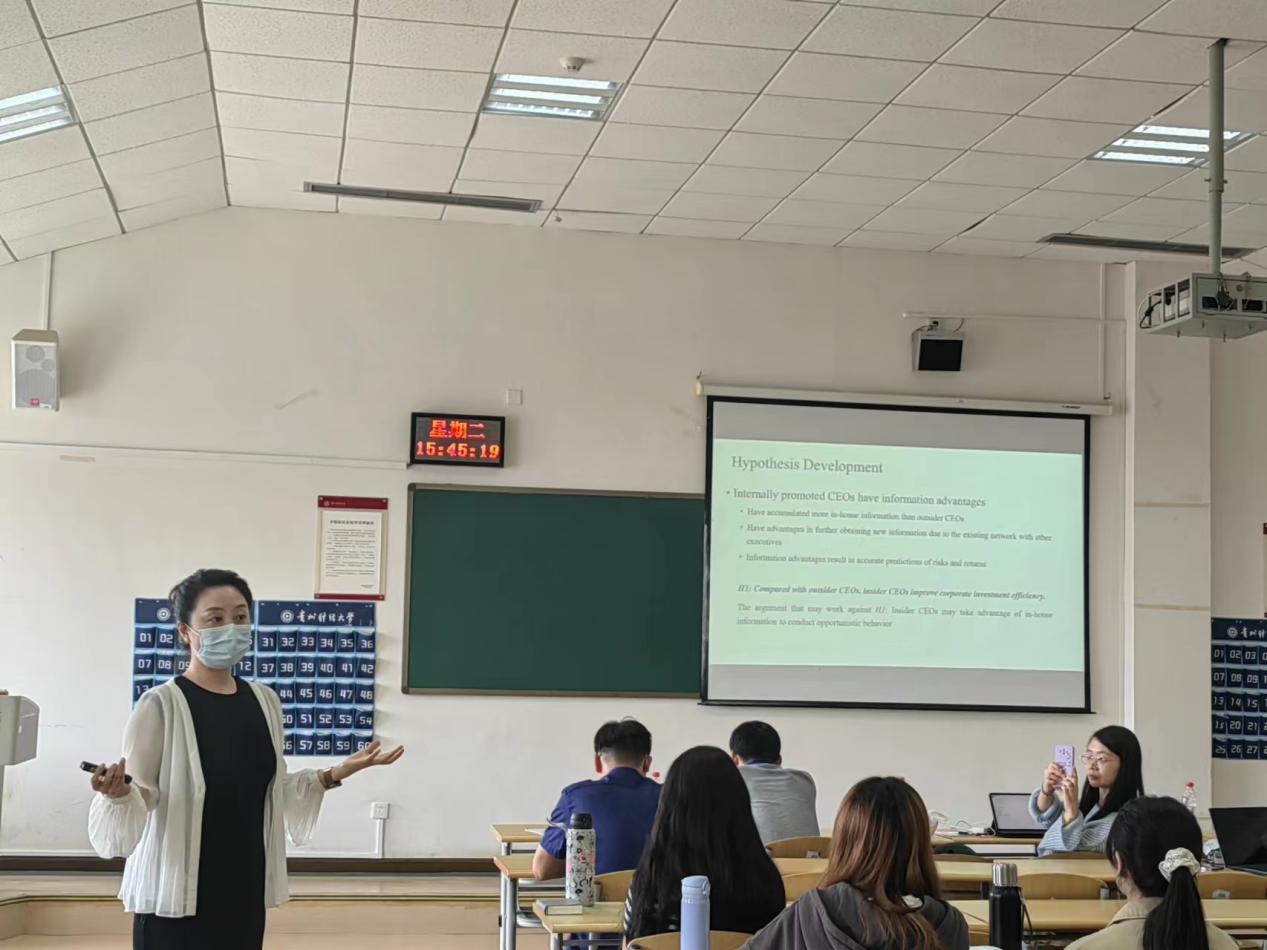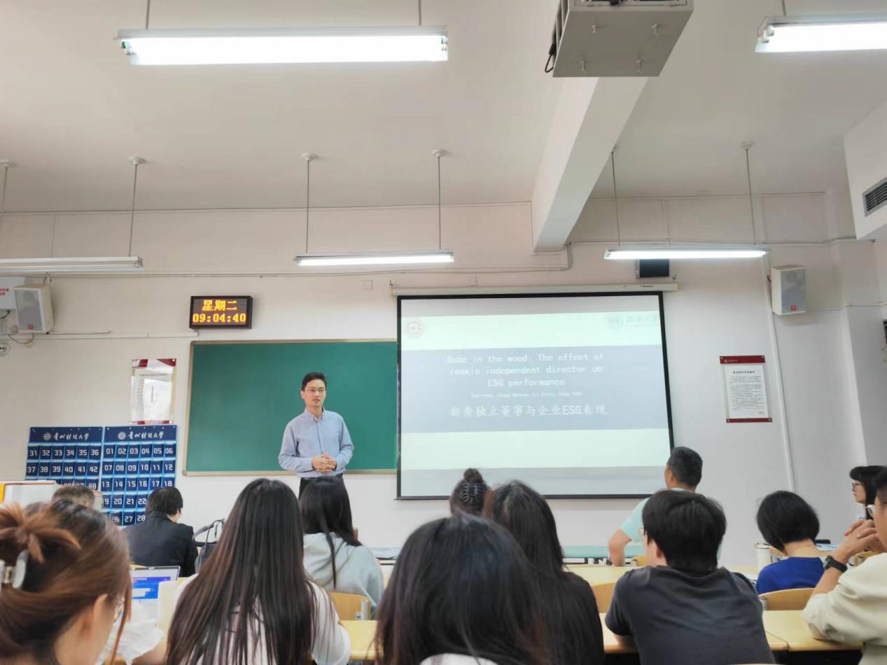 湖南大学曹丰、对外经济贸易大学刘慧龙、暨南大学窦欢、北京科技大学胡志颖分别以《Babe in the wood:The effect of rookie independent director on ESG performance 》《数字基础设施赋能企业事项识别—来自企业文本信息披露的经验证据》《“保险”的保险,起到保险作用了吗》《审计师合作网络与审计意见购买》为题进行了分享,并结合撰写论文、发表论文过程中的困惑,给予了建议,为公司师生开阔了学术视野,启发了研究思路。