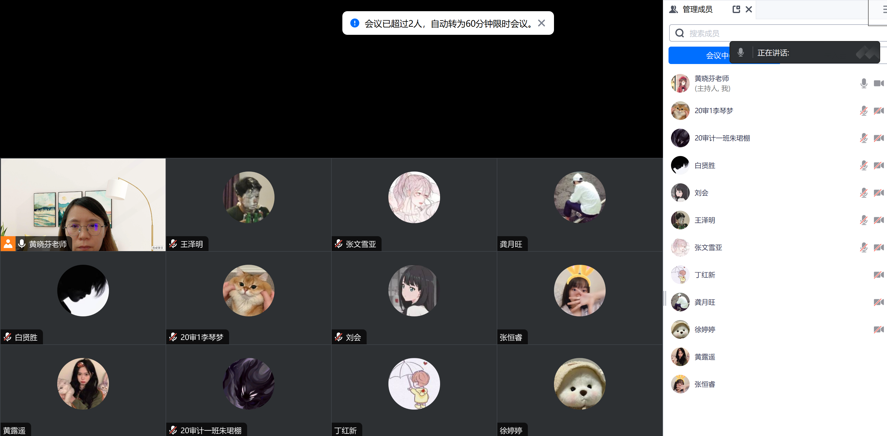7月27日晚上,审计系黄晓芬老师通过腾讯会议开展暑期专业实习线上教学巡查。