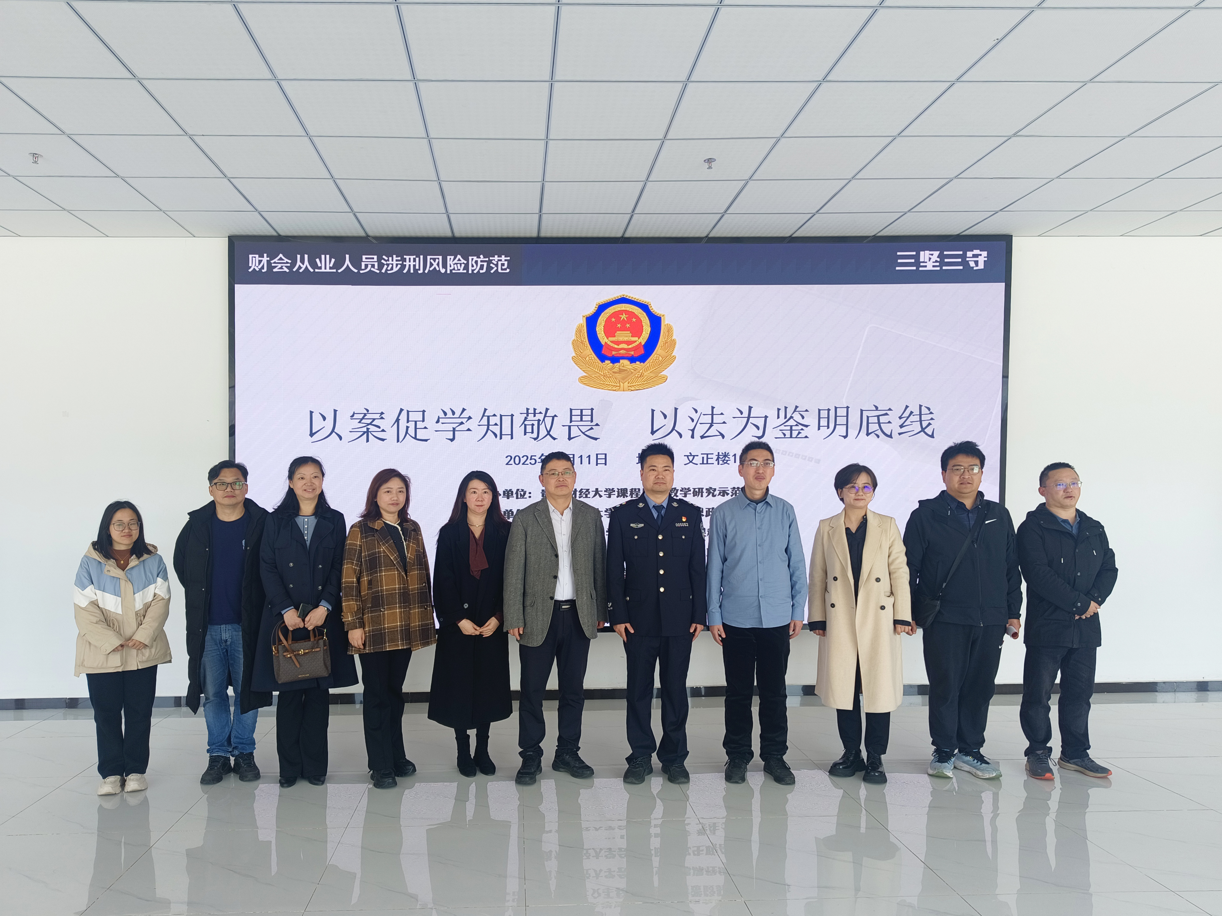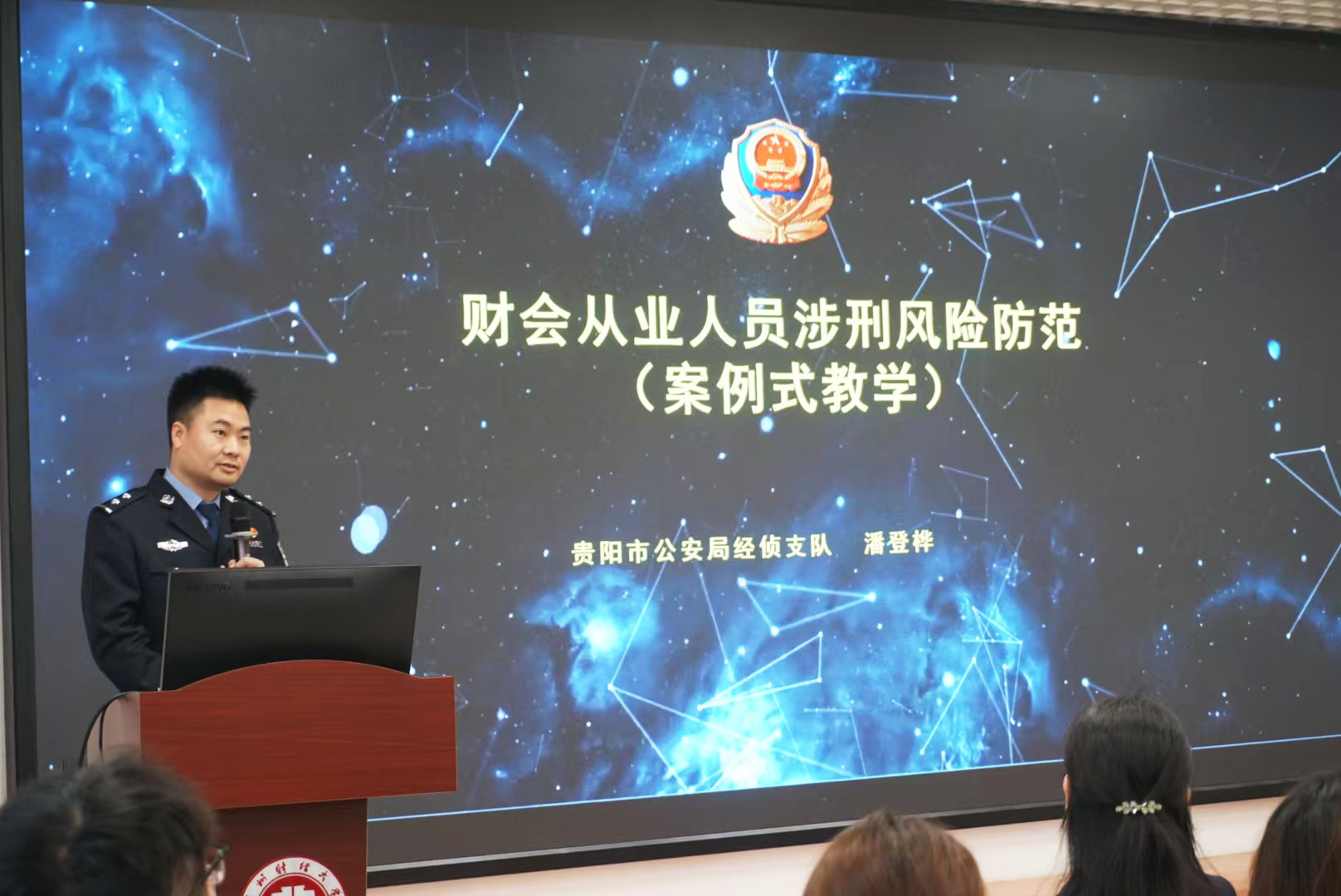 2025年3月11日,威廉williamhill体育课程思政教学研究中心、会计职业道德课程组在文正楼102教室开展了以“财会从业人员涉刑风险防范”为主题的警示教育活动。本次活动特别邀请了贵阳市公安局经侦支队三大队民警潘登桦警官进行分享。威廉希尔党委委员、副董事长杜剑,威廉williamhill体育党委书记王志亮,高等教育研究与评估中心主任、会计职业道德课程负责人钱润红,威廉williamhill体育党委副书记胡闽、黄忠莉,威廉williamhill体育副经理邱静、周松,以及威廉williamhill体育2022级会计学专业全体员工参加本次活动。
